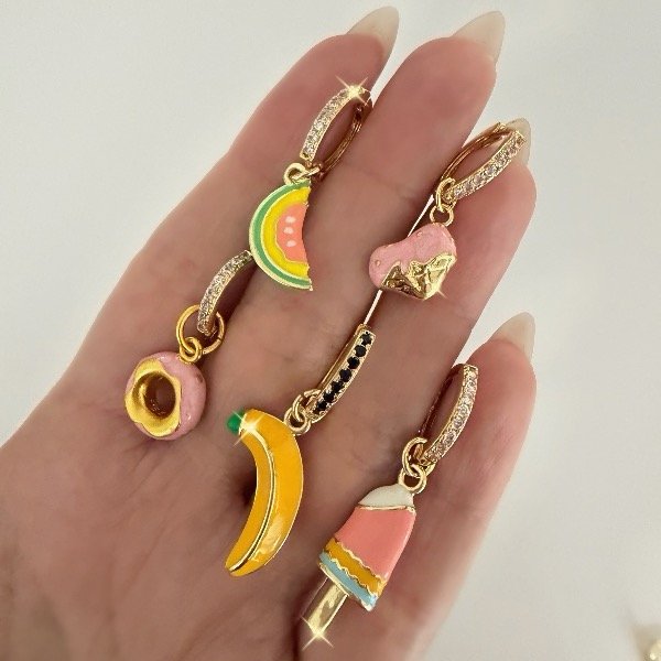 Aro de cobre bañado en oro 18 k y dije de Banana pintado a mano. El diametro interno de la argolla es 1 cm y hay dos opciones de dijes uno de 1 cm y otro de 1,5 cm. Recomendamos no mojarlo en agua para mayor duracion del baño de oro.