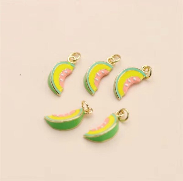 Aro de cobre bañado en oro 18 k y dije de Sandía pintado a mano. El diametro interno de la argolla es 1 cm el dije mide 1,5 cm. Recomendamos no mojarlo en agua para mayor duracion del baño de oro.